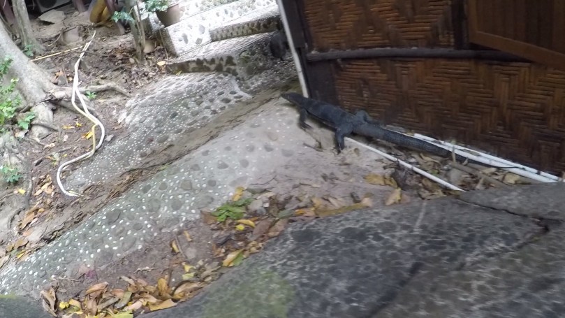 En el momento de la tormenta, que ha durado muy poco pero ha caído mucha agua, nos hemos metido al chiringuito a comer para hacer tiempo. Estábamos tan agusto que hemos pasado casi 4 horas allí charlando antes de retomar el camino. Y hemos visto un varano!