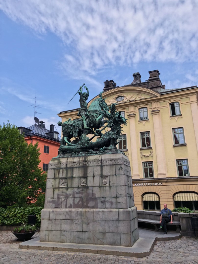 - Catedral de Estocolmo: en cuyo interior hay una escultura en honor a San Jorge y el dragón. Aquí no entramos porque en los Free Tours no se entra a lugares y mucho menos si son de pago, como lo era esta iglesia, pero a un par de manzanas puede verse una réplica de la escultura en plena calle, con la diferencia de que la interior es de madera y la exterior de hierro.