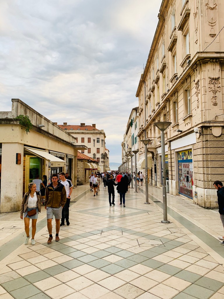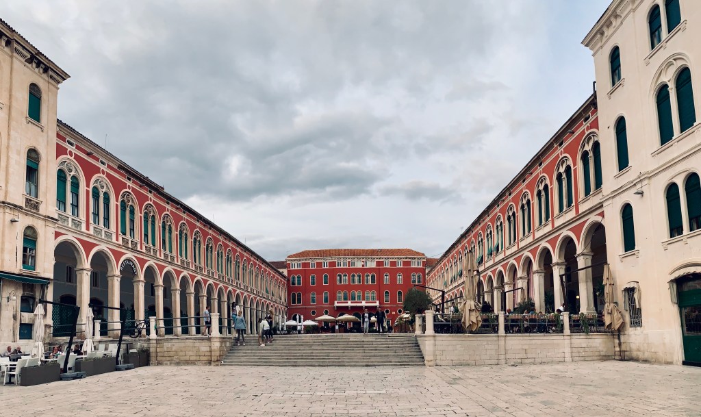 Después he pasado por la Plaza de la República, fuera del recinto del Palacio Diocleciano. Lo que sería la Plaza Mayor de Madrid o de cualquier ciudad Española, rodeada por todas partes de edificios con arcos, en este caso de color rojos. Fue construida en el siglo XIX por orden del alcalde Bajamonti, imitando a la Plaza San Marco de Venecia como muestra de que Split se apoya en la tradición italiana.