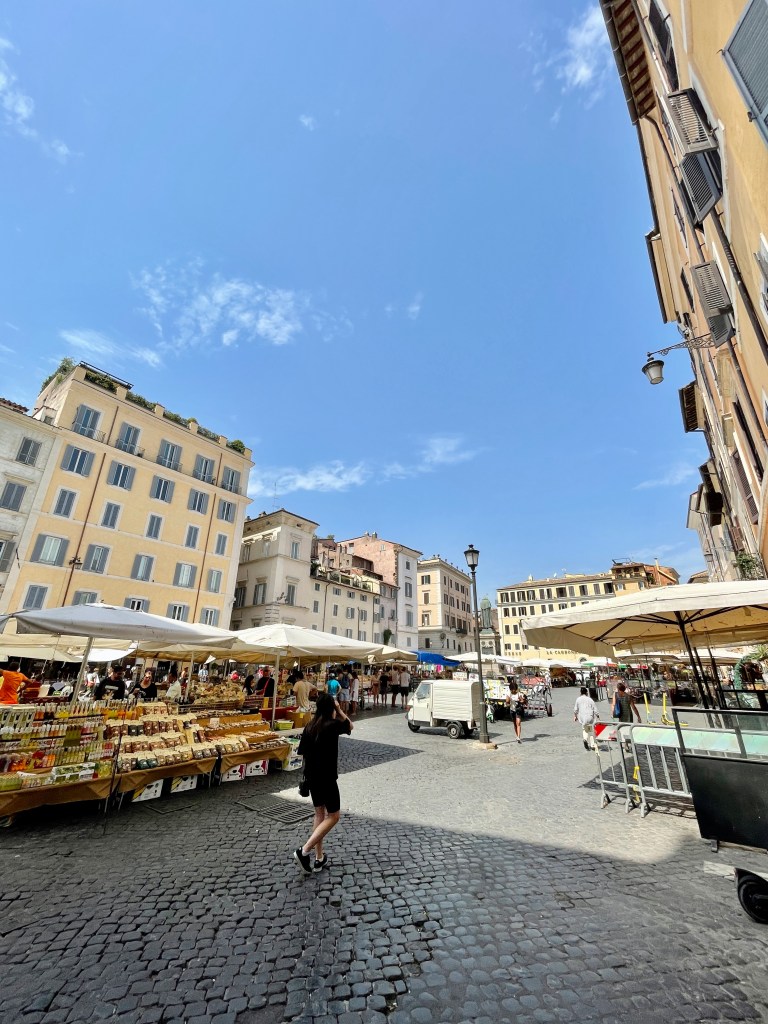 Fue construida en el año 1456 por encargo del Papa Calixto III en el lugar donde se ubicaba un campo de flores, del cual tomó su nombre la plaza, y es una de las más animadas de Roma, pues cada día de la semana, excepto el domingo, alberga un mercado de productos frescos. Los romanos autóctonos vienen aquí, pero también muchos turistas, ya que han ido apareciendo progresivamente los típicos puestos de souvenirs. Por la noche, los puestos dejan espacio a las terrazas de varios restaurantes que hay en ella.