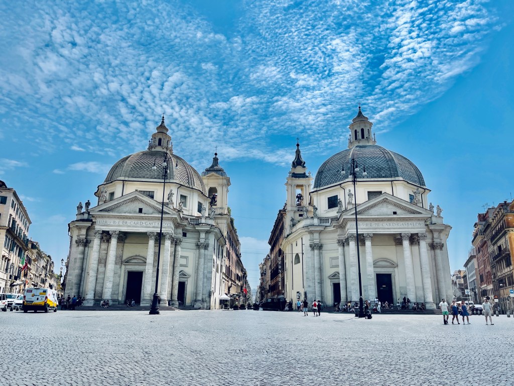 Hay 3 iglesias en la plaza, pero dos de ellas llaman más la atención porque, pese a unos pequeños detalles, a primera vista parecen «gemelas»: Santa María in Montesanto y Santa María dei Miracoli.