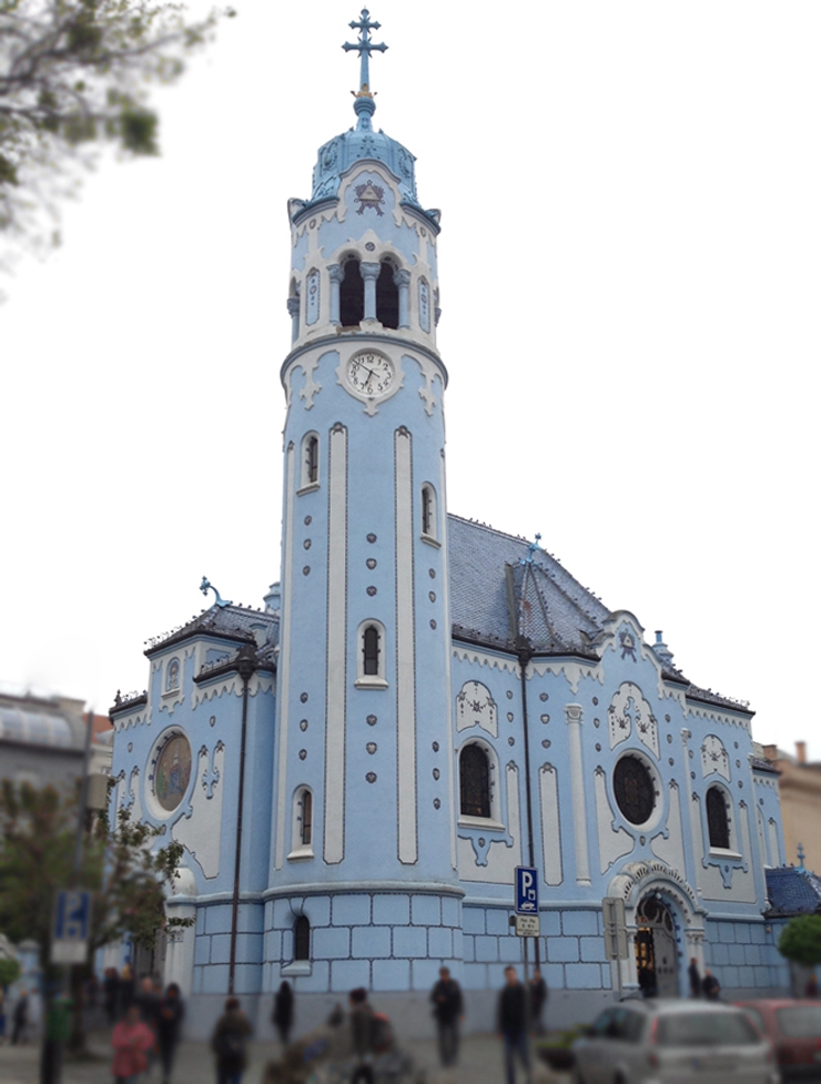 La Iglesia de Santa Isabel es conocida popularmente como la “Iglesia Azul” por el característico color con el que está pintada su fachada. Es un edificio de estilo Art Nouveau, construido a principios del siglo XX y una de las grandes obras del arquitecto húngaro Ödon Lechner. Su torre cilíndrica está coronada por una cruz de dos aspas, conocida como cruz doble bizantina y que hoy forma parte del escudo nacional de Eslovaquia.