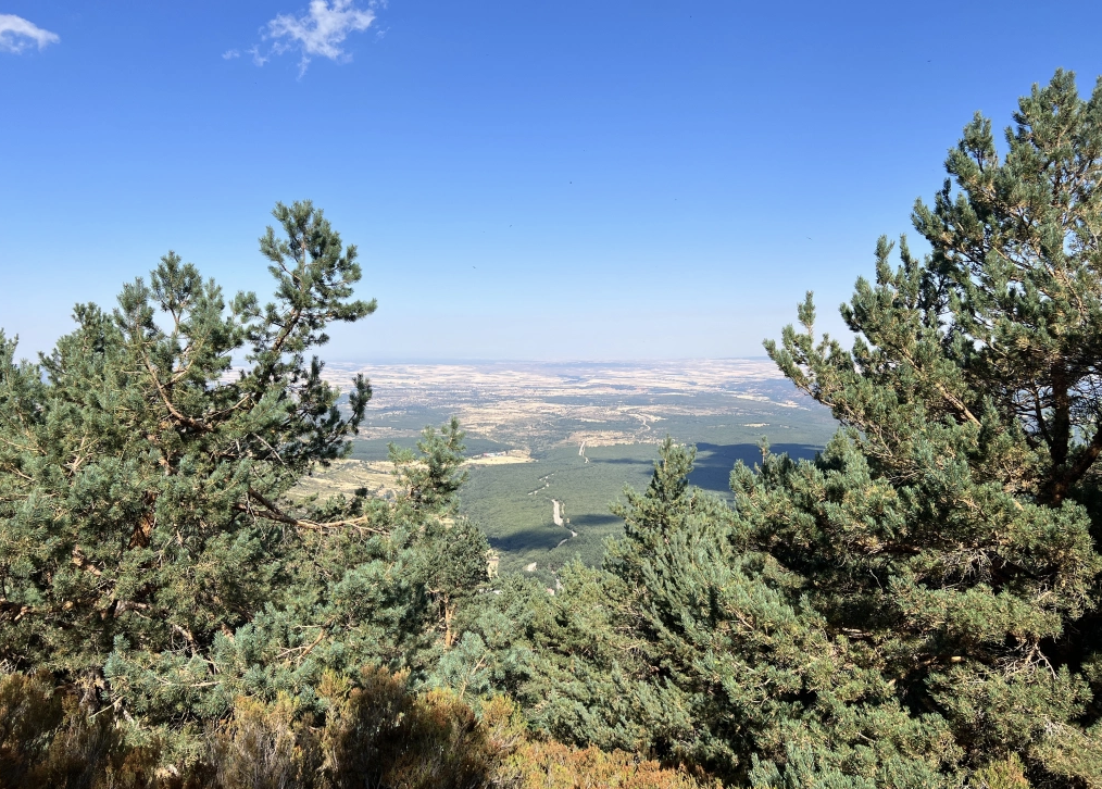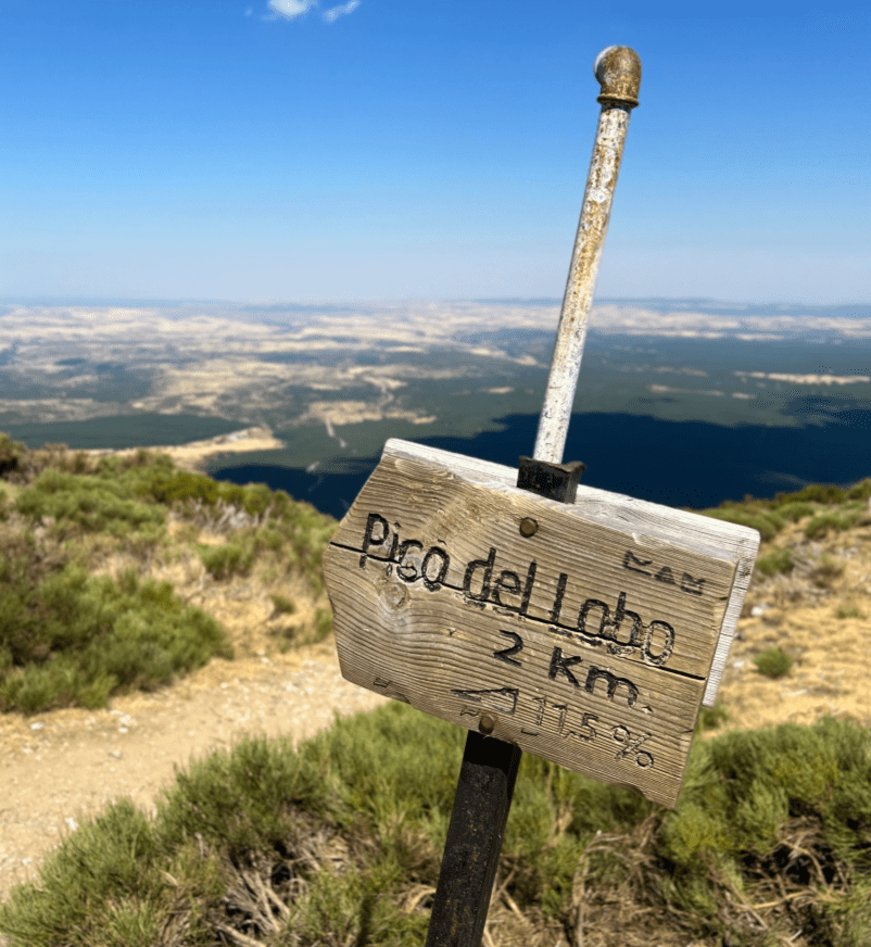 Pasados unos 2,5km los árboles casi desaparecen y ya se puede ver una espectacular panorámica de la provincia de Segovia mientras se recorren los 500m restantes hasta el Cerro del Aventadero, punto en el que se alcanza la cresta de la montaña y desde donde se ve Guadalajara a un lado y Segovia al otro. Desde aquí hay que continuar 2km más hacia la derecha, siguiendo la dirección que marca el cartel hasta el Pico del Lobo. Una vez superado el Collado del Aventadero, la cima se ve perfectamente a lo lejos, incluido el feísimo edificio en ruinas junto a ella…