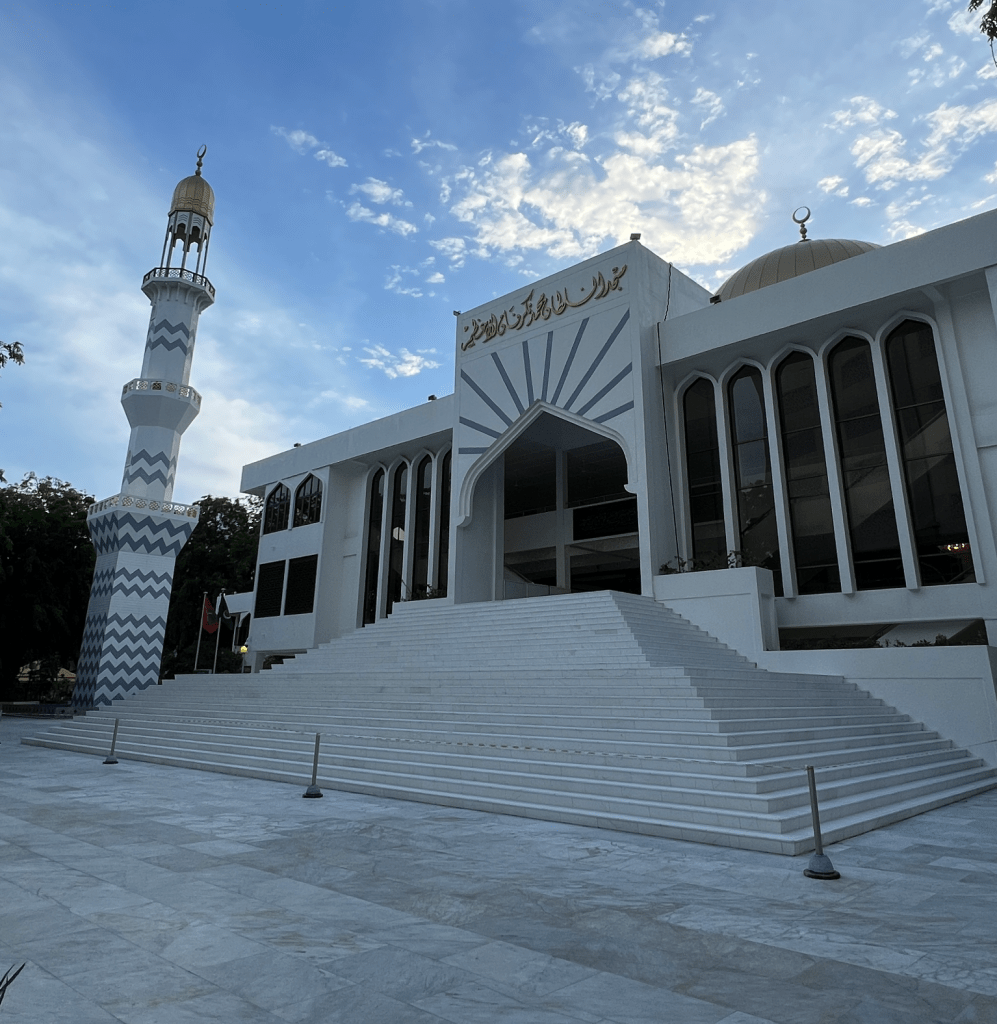 - Gran Mezquita del Viernes: es sin duda el lugar más bonito de Malé, sustituye a la antigua, de la que os hablo en el punto 9, y fue construida en 1984 gracias a la financiación de los países del Golfo, Pakistán, Brunei y Malasia. Este enorme edificio blanco y su cúpula dorada fue hasta 2018 la mezquita más grande del país, y se puede visitar de 9:00 a 17:00 siempre en pantalón largo (mujeres falda larga o vestido) y sin mostrar los hombros.