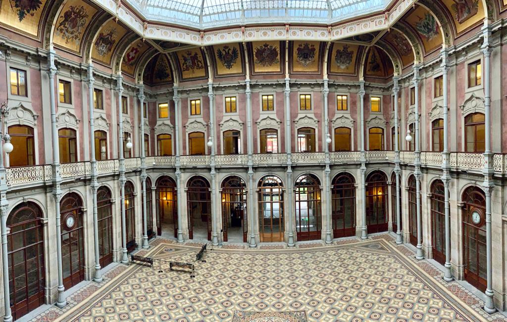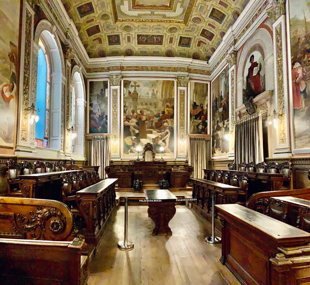 Se trata del patio central, lo primero que uno encuentra nada más entrar, presidido por una enorme y preciosa cúpula de cristal en el techo. Se llama así porque en la parte superior hay murales con los escudos antiguos de Portugal y de otras 27 naciones con las que la Asociación Comercial de Oporto negociaba ya en el siglo XIX.