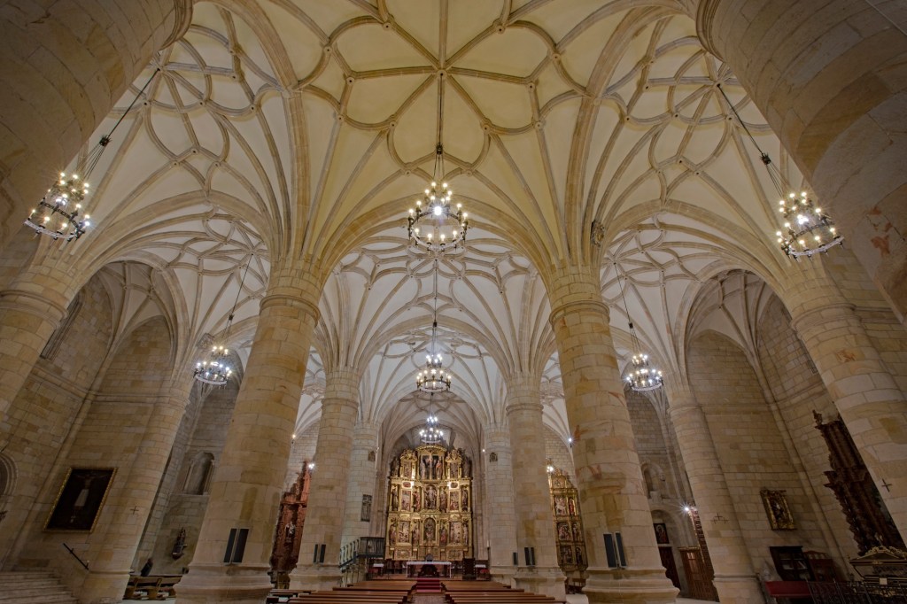 El claustro de este antiguo monasterio hospitalario sorprende con arcos entrecruzados de sabor casi árabe que no encontrarás en otro lugar de España. Pasa la novatada: intenta fotografiar el reflejo de las columnas sobre el estanque central.